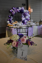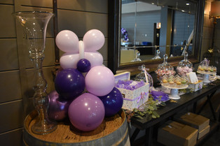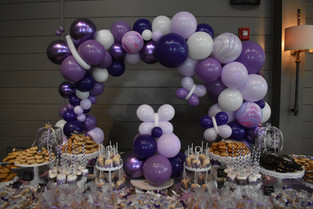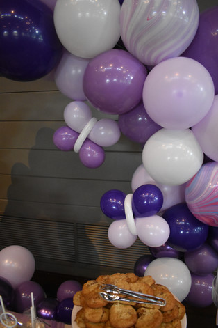 We were asked to create a gorgeous dessert table backdrop. We created an organic-styled Balloon Ring, sometimes called an Infinity Hoop or Ring, tapered in sizing to by asymmetrical. We used shades of purple and white. We added in some shimmery chrome purple balloons for extra sparkle and a few incredible striped agates for interest.