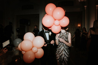 We were asked to create gorgeous organic balloon garland for the beautiful ballroom area to highlight the stage focal point at one end of a long room where the reception would be held. The room itself is gorgeous already, but adding flowy and bubbly organic balloon garland in a white and blush palette with pops of gold across the front of the stage created a magical illusion. Here's the happy couple standing for a photo!