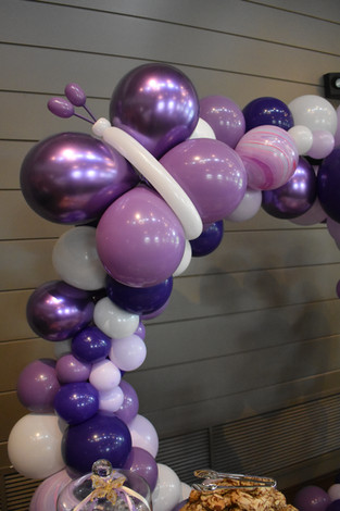 We were asked to create a gorgeous dessert table backdrop. We created an organic-styled Balloon Ring, sometimes called an Infinity Hoop or Ring, tapered in sizing to by asymmetrical. We used shades of purple and white. We added in some shimmery chrome purple balloons for extra sparkle and a few incredible striped agates for interest.